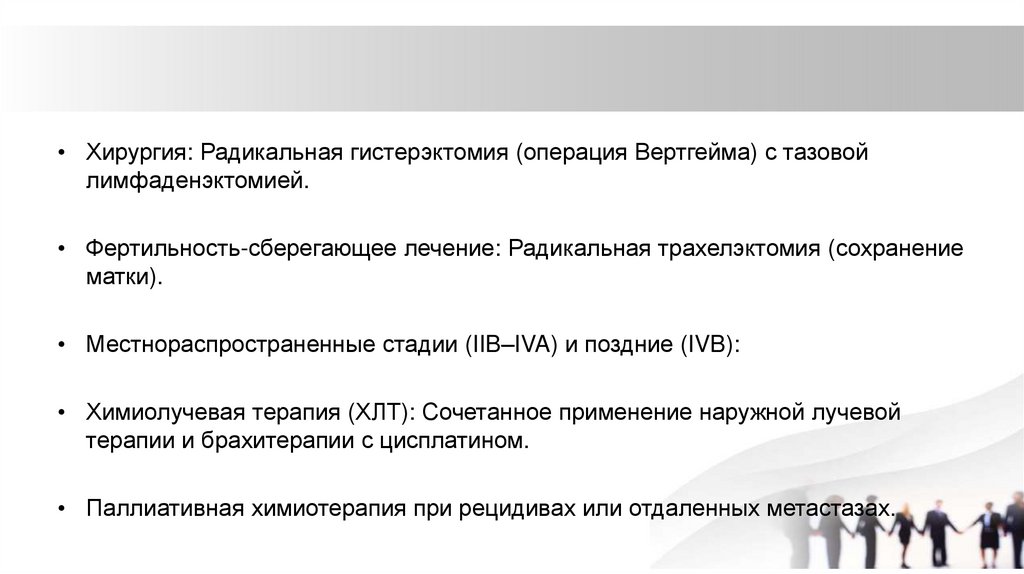 • Хирургия: Радикальная гистерэктомия (операция Вертгейма) с тазовойлимфаденэктомией.