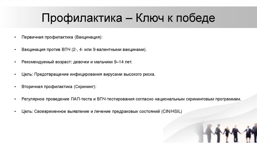 Регулярное проведение ПАП-теста и ВПЧ-тестирования согласно национальным скрининговым программам.