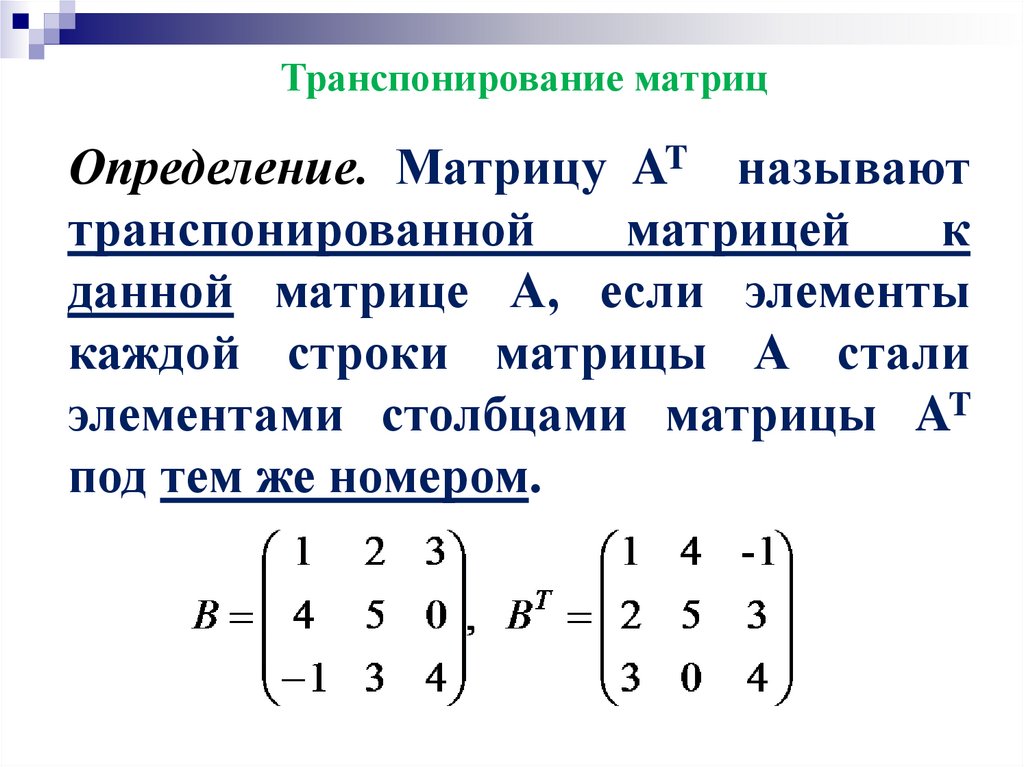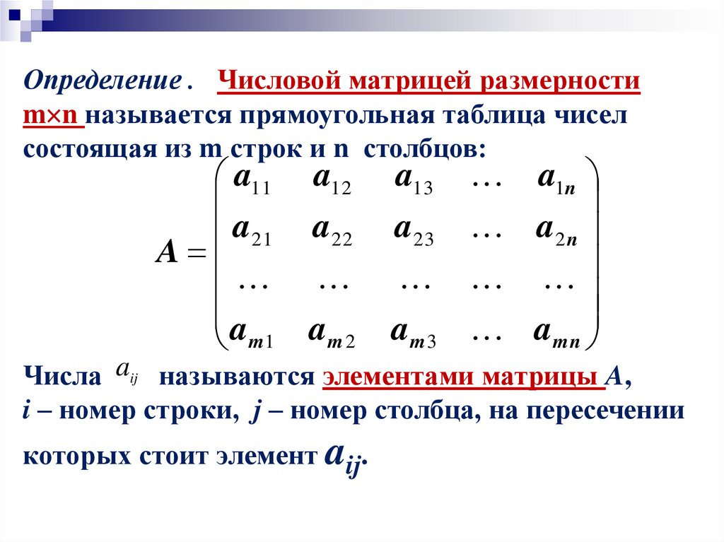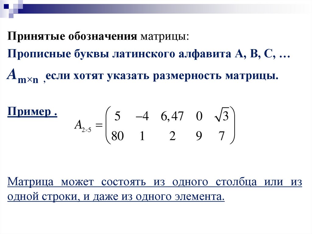 Принятые обозначения матрицы:Прописные буквы латинского алфавита A, B, C, …