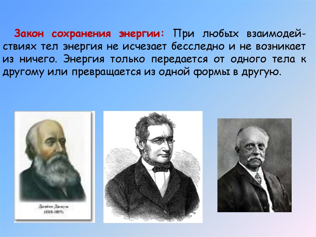 Закон сохранения энергии: При любых взаимодействиях тел энергия не исчезает бесследно и не возникаетиз ничего. Энергия только передается от одного тела к