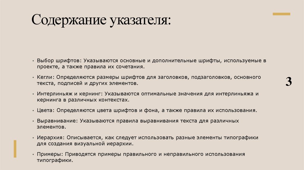 Содержание указателя:Выбор шрифтов: Указываются основные и дополнительные шрифты, используемые в