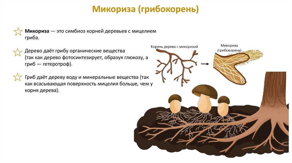 Микориза (грибокорень)Микориза — это симбиоз корней деревьев с мицелием