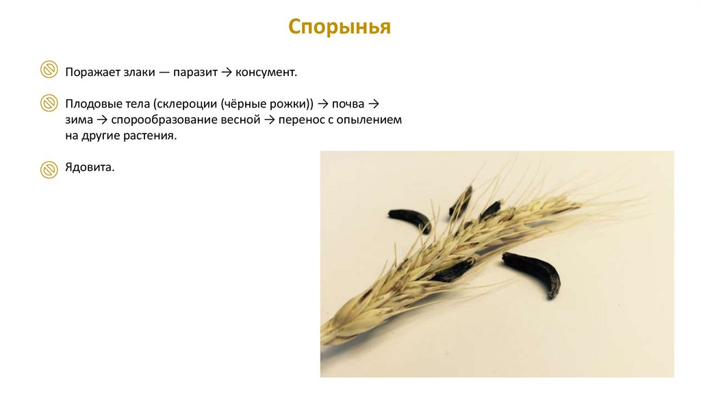 СпорыньяПоражает злаки — паразит → консумент.