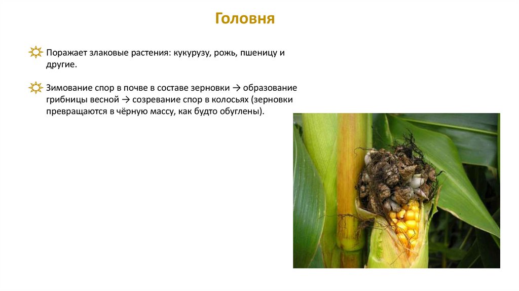 ГоловняПоражает злаковые растения: кукурузу, рожь, пшеницу и