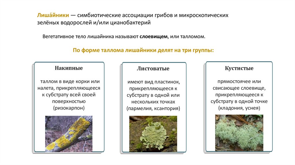 По форме таллома лишайники делят на три группы: