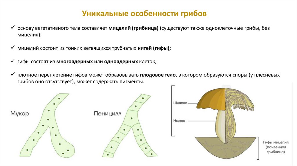 Уникальные особенности грибовоснову вегетативного тела составляет мицелий (грибница) (существуют также одноклеточные грибы, без