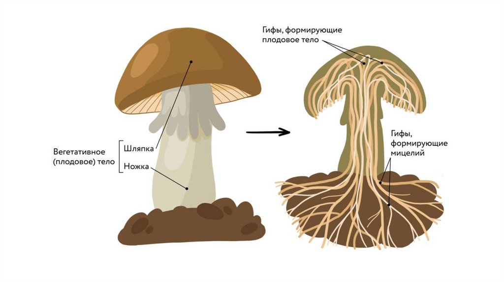 мицелий состоит из тонких ветвящихся трубчатых нитей (гифы);