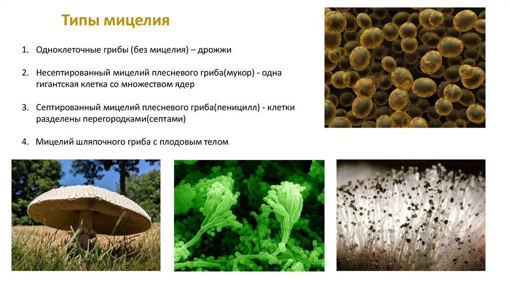Типы мицелия1. Одноклеточные грибы (без мицелия) – дрожжи
