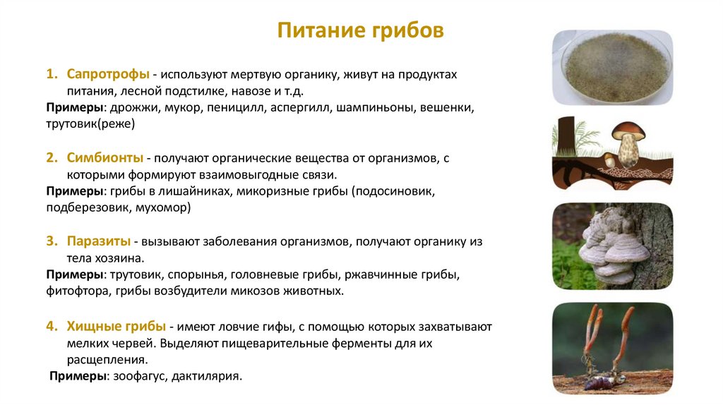 Питание грибов1. Сапротрофы - используют мертвую органику, живут на продуктах