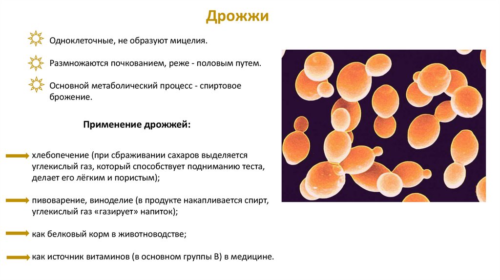 ДрожжиОдноклеточные, не образуют мицелия.
