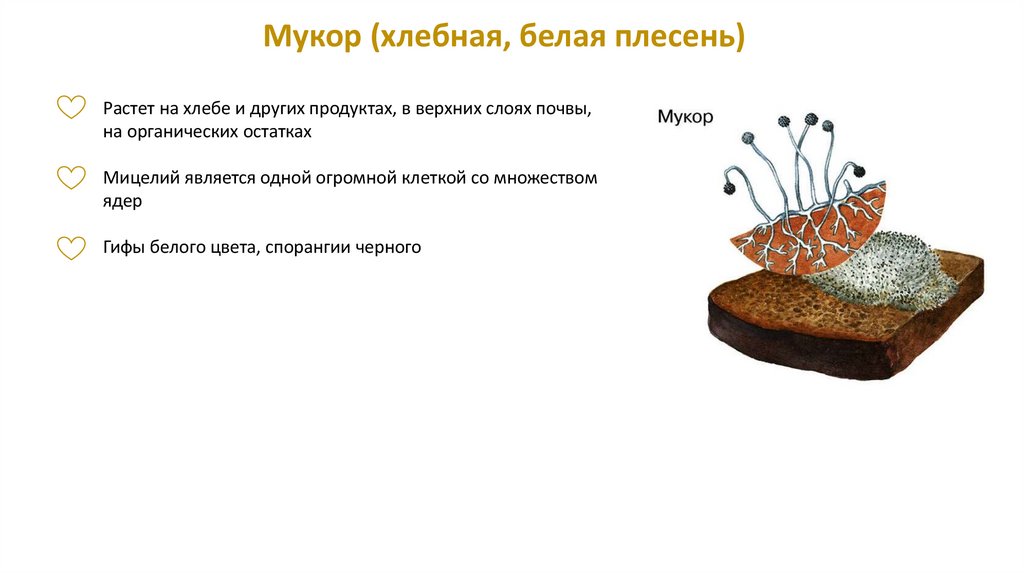 Мукор (хлебная, белая плесень)Растет на хлебе и других продуктах, в верхних слоях почвы,