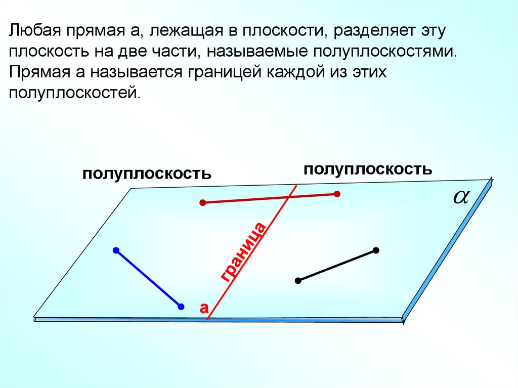 Любая прямая а, лежащая в плоскости, разделяет этуплоскость на две части, называемые полуплоскостями.