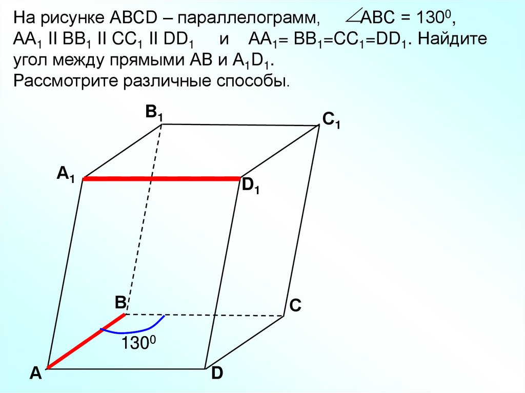 На рисунке АВСD – параллелограмм, АВС = 1300,АА1 II BB1 II CC1 II DD1 и АА1= BB1=CC1=DD1. Найдите