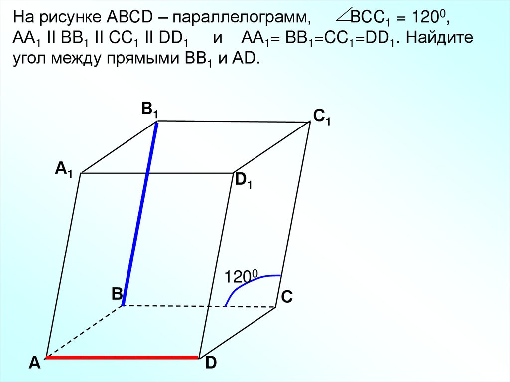 На рисунке АВСD – параллелограмм, ВСC1 = 1200,АА1 II BB1 II CC1 II DD1 и АА1= BB1=CC1=DD1. Найдите