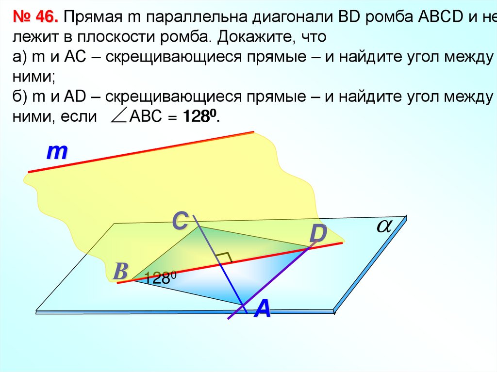 № 46. Прямая m параллельна диагонали ВD ромба АВСD и нележит в плоскости ромба. Докажите, что