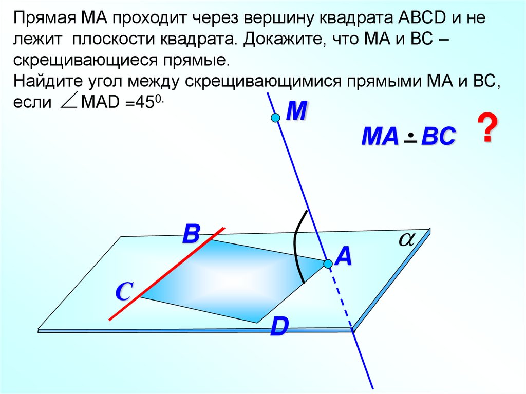 Прямая МА проходит через вершину квадрата АВСD и нележит плоскости квадрата. Докажите, что МА и ВС –