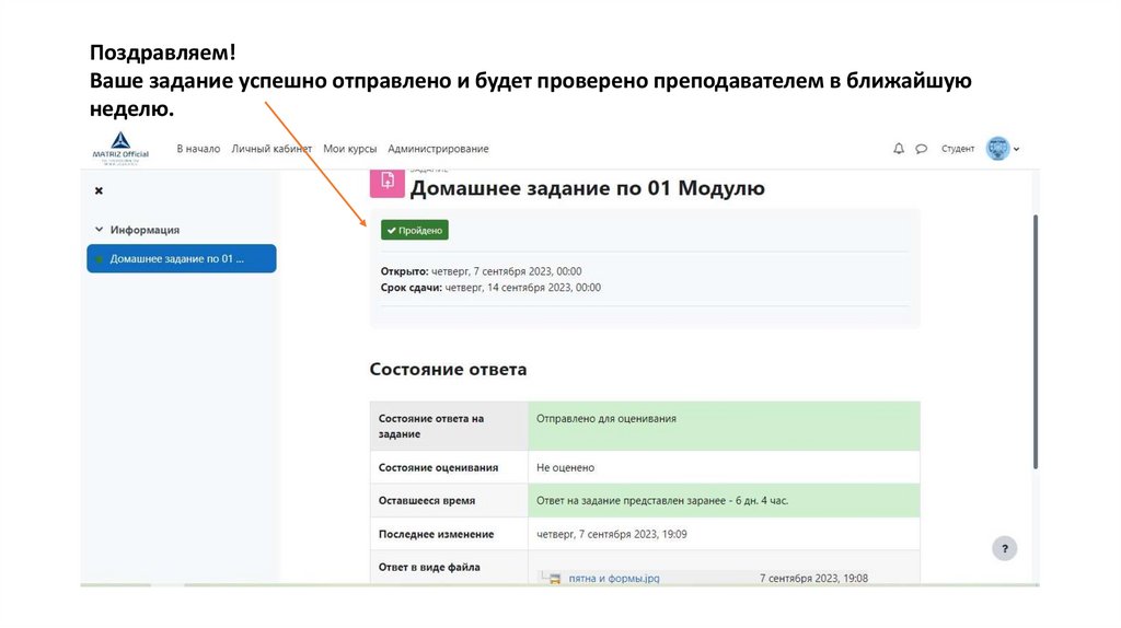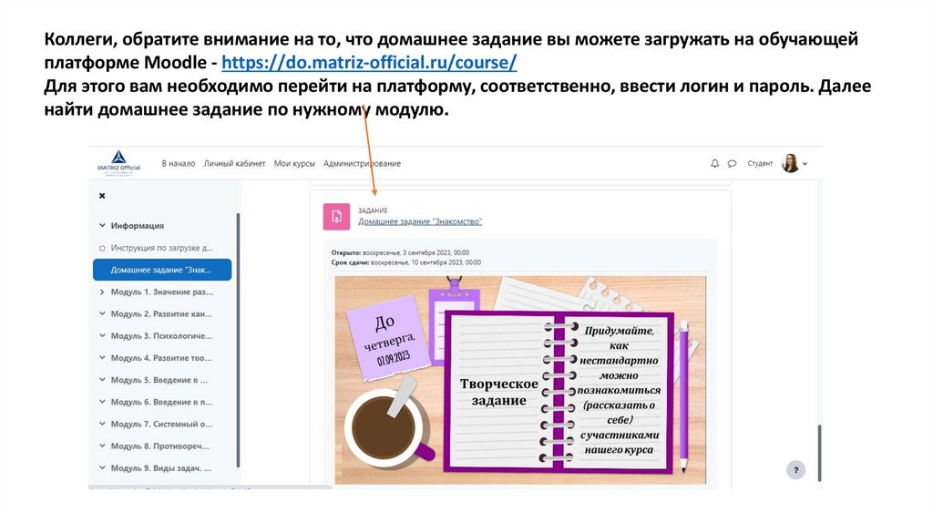 Коллеги, обратите внимание на то, что домашнее задание вы можете загружать на обучающейплатформе Moodle - https://do.matriz-official.ru/course/