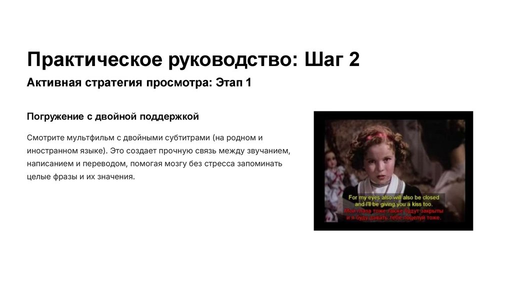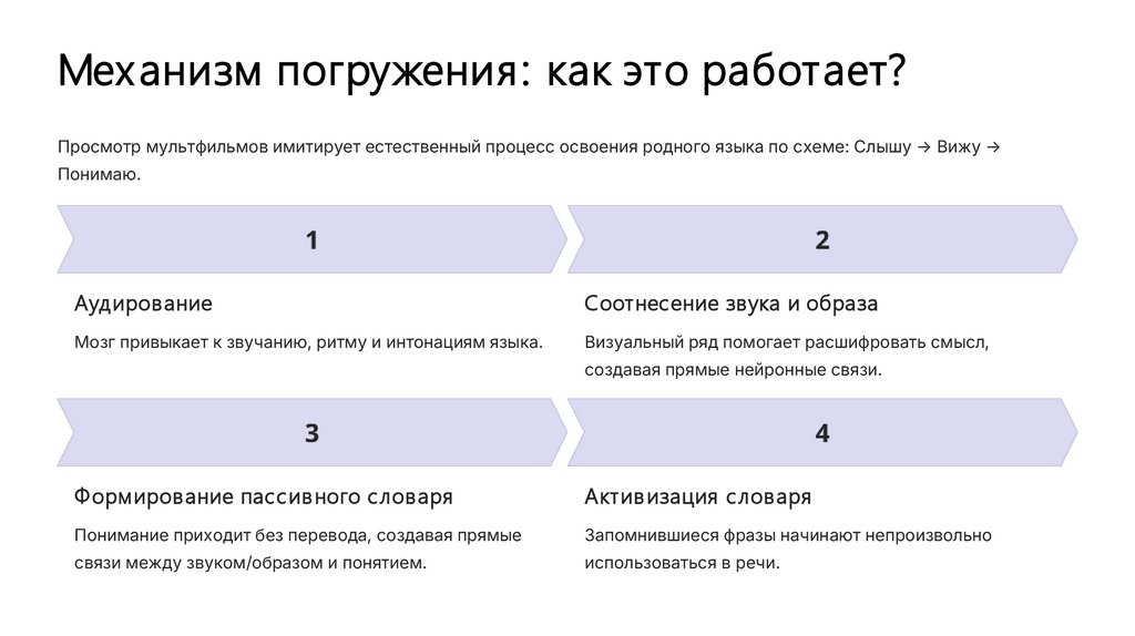Мех анизм погружения: как это работает?Просмотр мультфильмов имитирует естественный процесс освоения родного языка по схеме: Слышу → Вижу →