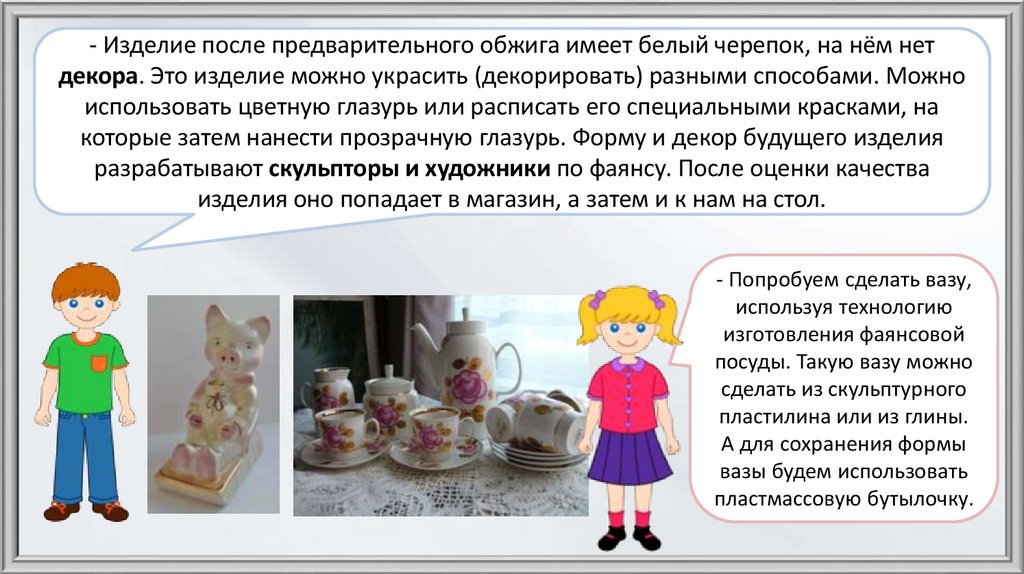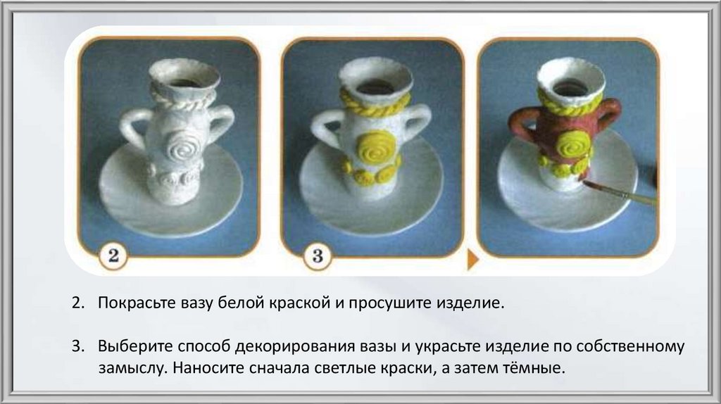 - Изделие после предварительного обжига имеет белый черепок, на нём нетдекора. Это изделие можно украсить (декорировать) разными способами. Можно