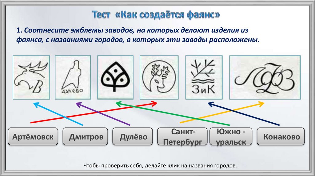 1. Соотнесите эмблемы заводов, на которых делают изделия изфаянса, с названиями городов, в которых эти заводы расположены.