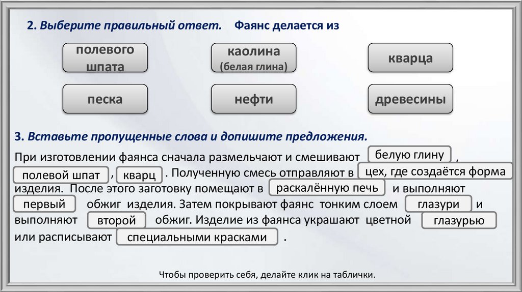 2. Выберите правильный ответ. Фаянс делается изполевого