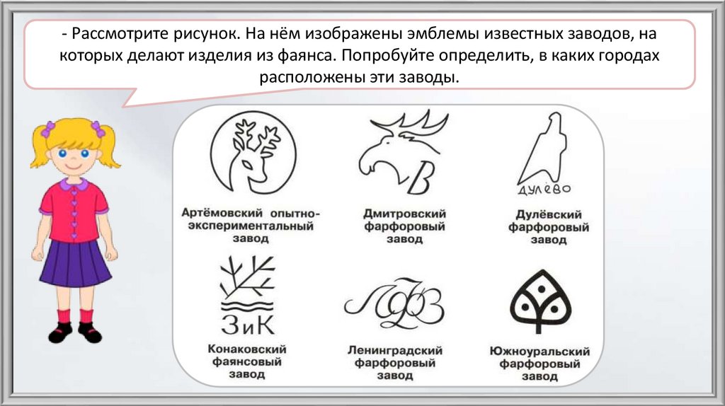 - Рассмотрите рисунок. На нём изображены эмблемы известных заводов, накоторых делают изделия из фаянса. Попробуйте определить, в каких городах