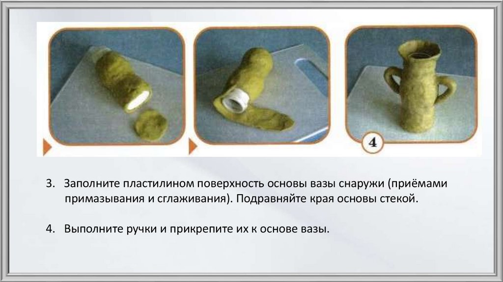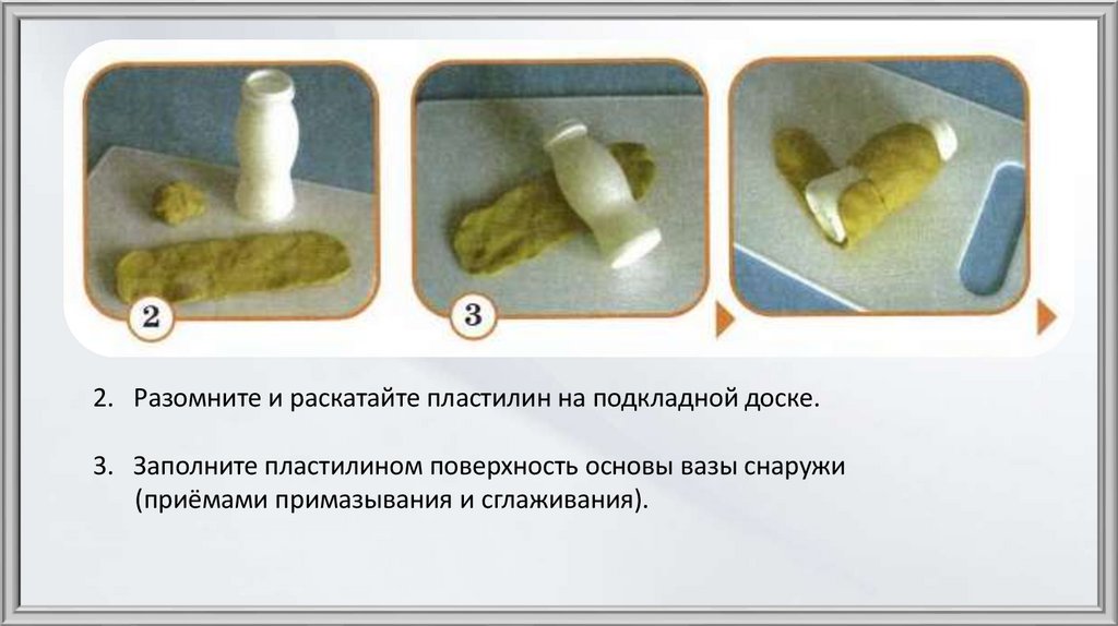 2. Разомните и раскатайте пластилин на подкладной доске.3. Заполните пластилином поверхность основы вазы снаружи