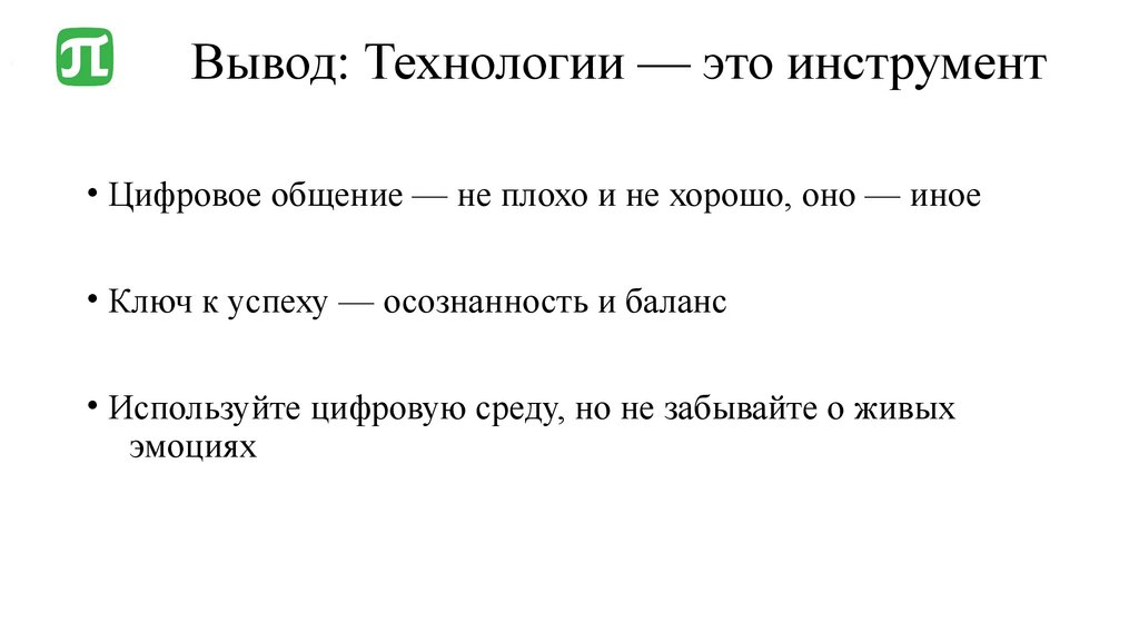 Вывод: Технологии — это инструмент• Цифровое общение — не плохо и не хорошо, оно — иное
