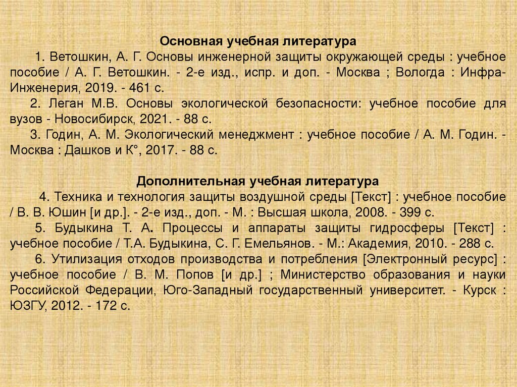 Основнaя учебная литерaтурa1. Ветошкин, А. Г. Основы инженерной защиты окружающей среды : учебное