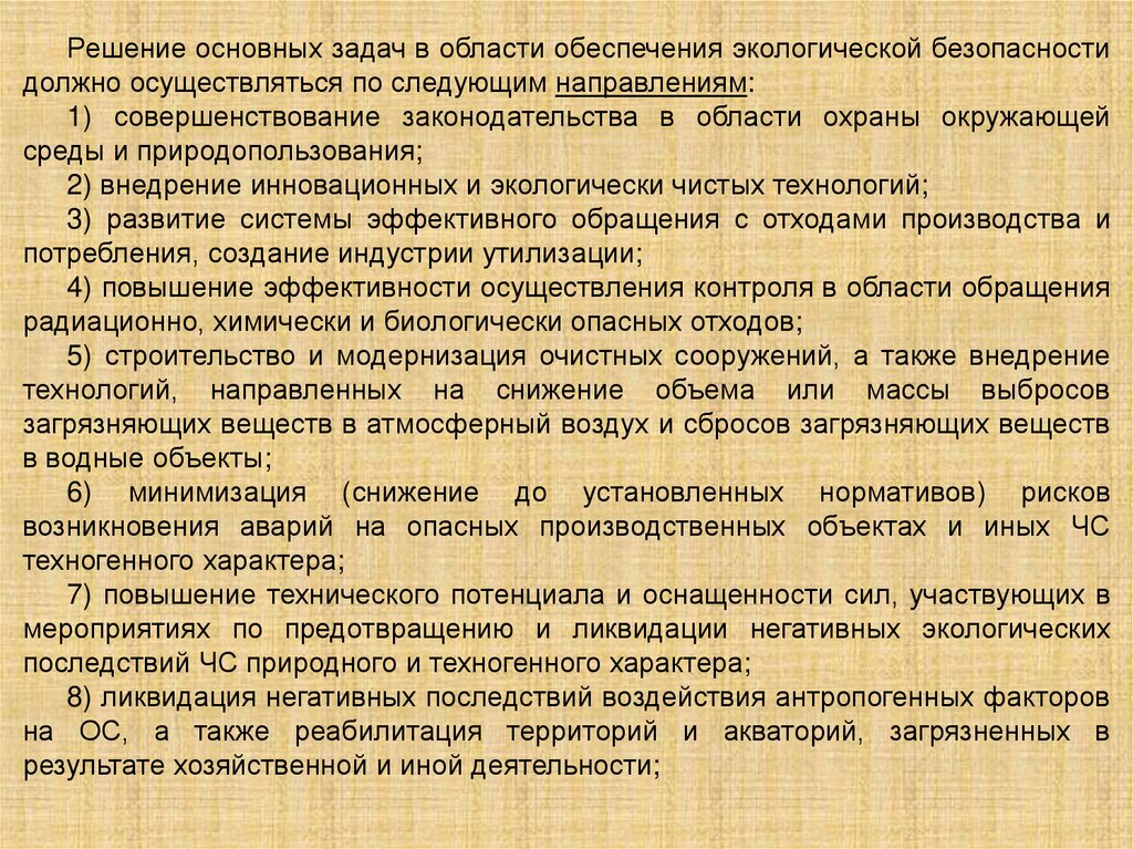 Решение основных задач в области обеспечения экологической безопасностидолжно осуществляться по следующим направлениям: