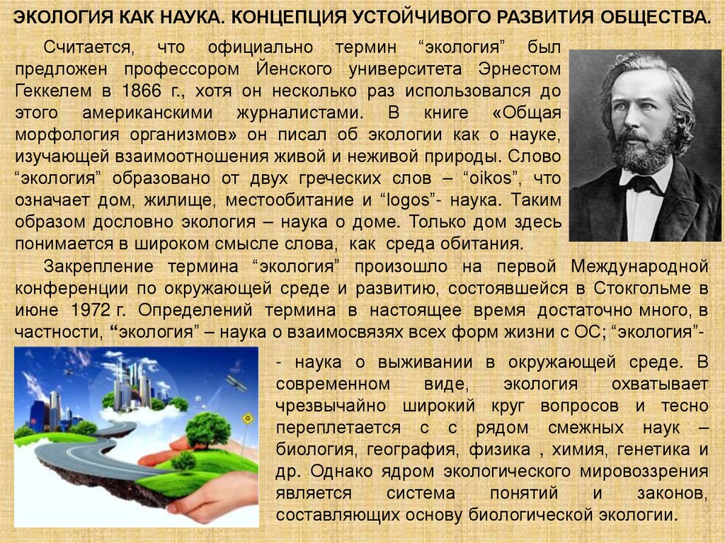 ЭКОЛОГИЯ КАК НАУКА. КОНЦЕПЦИЯ УСТОЙЧИВОГО РАЗВИТИЯ ОБЩЕСТВА.Считается, что официально термин “экология” был