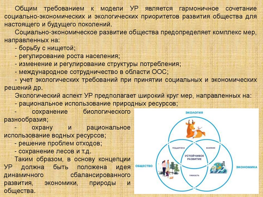 Общим требованием к модели УР является гармоничное сочетаниесоциально-экономических и экологических приоритетов развития общества для