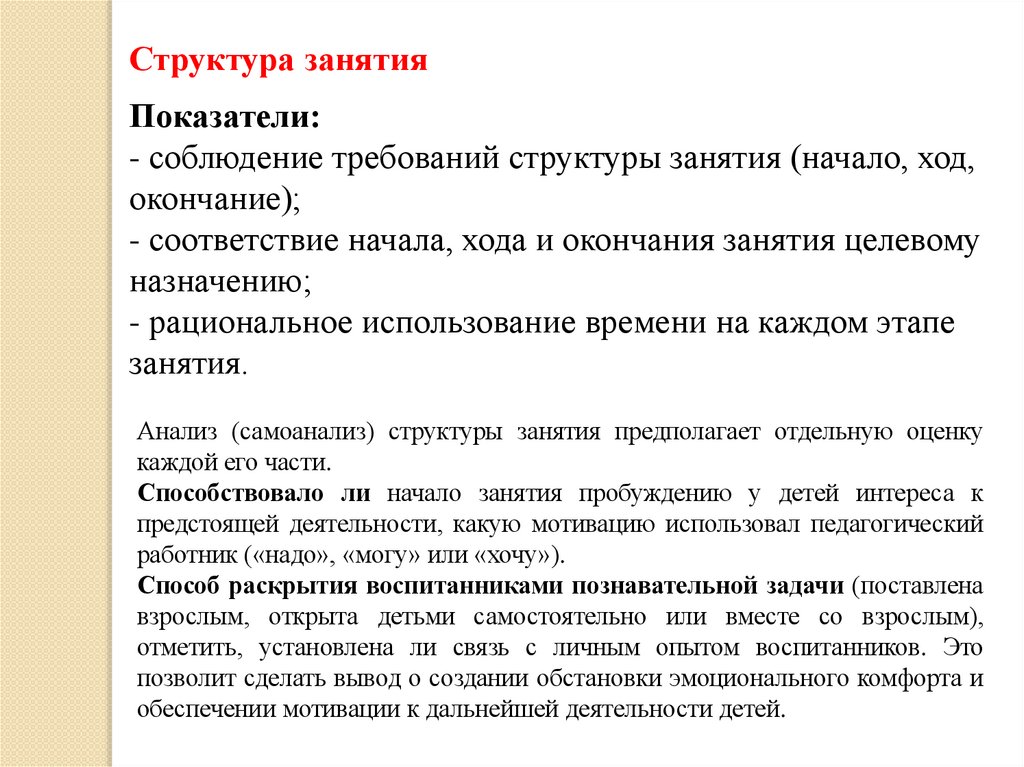 Анализ (самоанализ) структуры занятия предполагает отдельную оценку