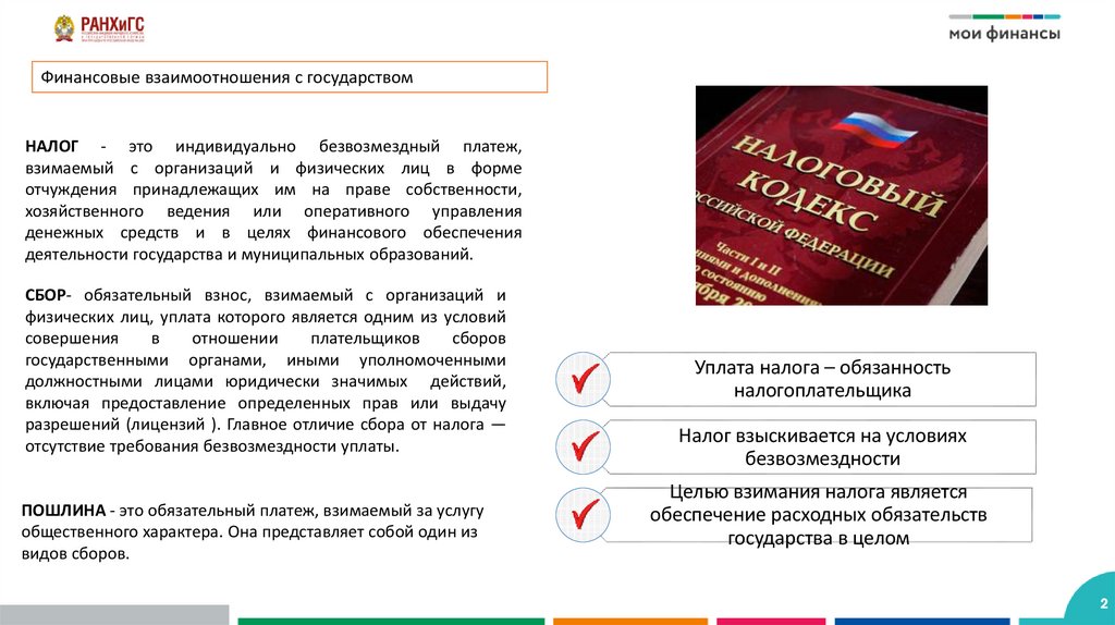 Финансовые взаимоотношения с государствомНАЛОГ - это индивидуально безвозмездный платеж,