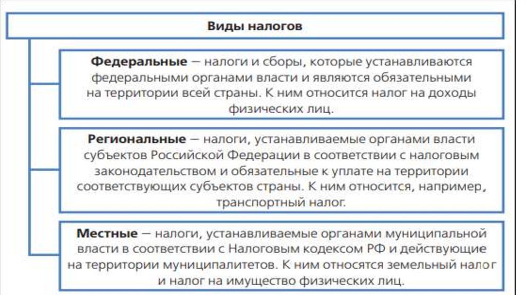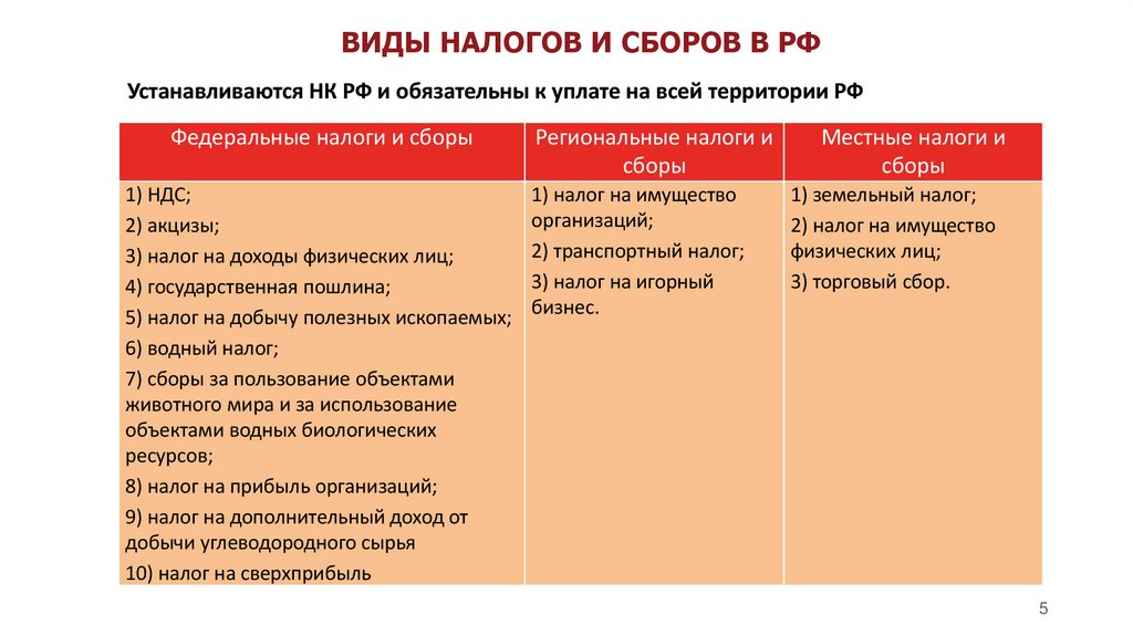 ВИДЫ НАЛОГОВ И СБОРОВ В РФУстанавливаются НК РФ и обязательны к уплате на всей территории РФ