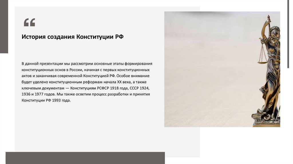 История создания Конституции РФВ данной презентации мы рассмотрим основные этапы формирования