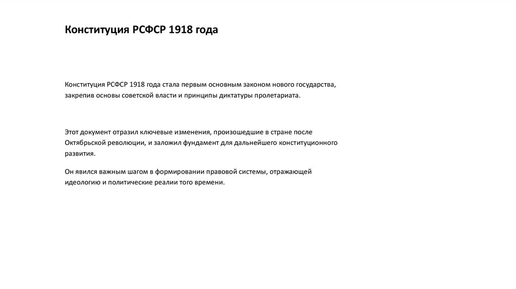 Конституция РСФСР 1918 годаКонституция РСФСР 1918 года стала первым основным законом нового государства,