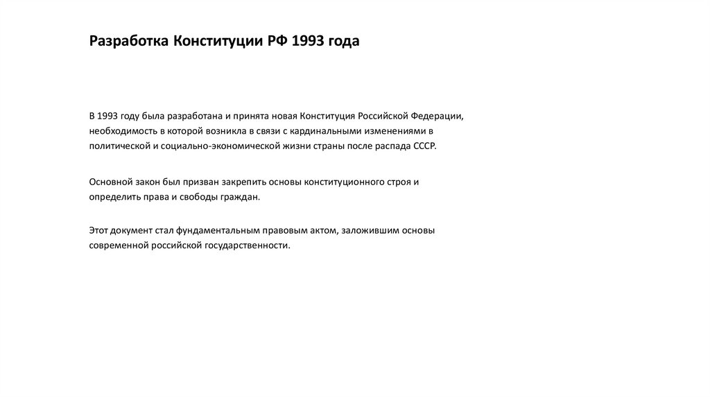 Разработка Конституции РФ 1993 годаВ 1993 году была разработана и принята новая Конституция Российской Федерации,