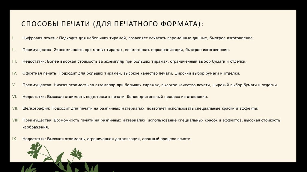 VIII. Преимущества: Возможность печати на различных материалах, использование специальных красок и эффектов, высокая стойкость