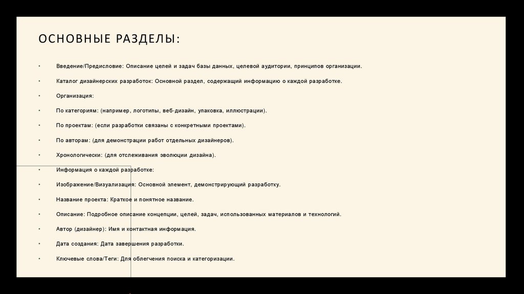 ОСНОВНЫЕ РАЗДЕЛЫ:Введение/Предисловие: Описание целей и задач базы данных, целевой аудитории, принципов организации.