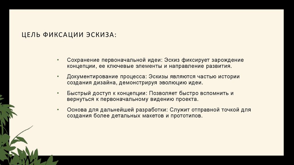 ЦЕЛЬ ФИКСАЦИИ ЭСКИЗА:Сохранение первоначальной идеи: Эскиз фиксирует зарождение