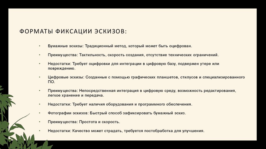 ФОРМАТЫ ФИКСАЦИИ ЭСКИЗОВ:Бумажные эскизы: Традиционный метод, который может быть оцифрован.