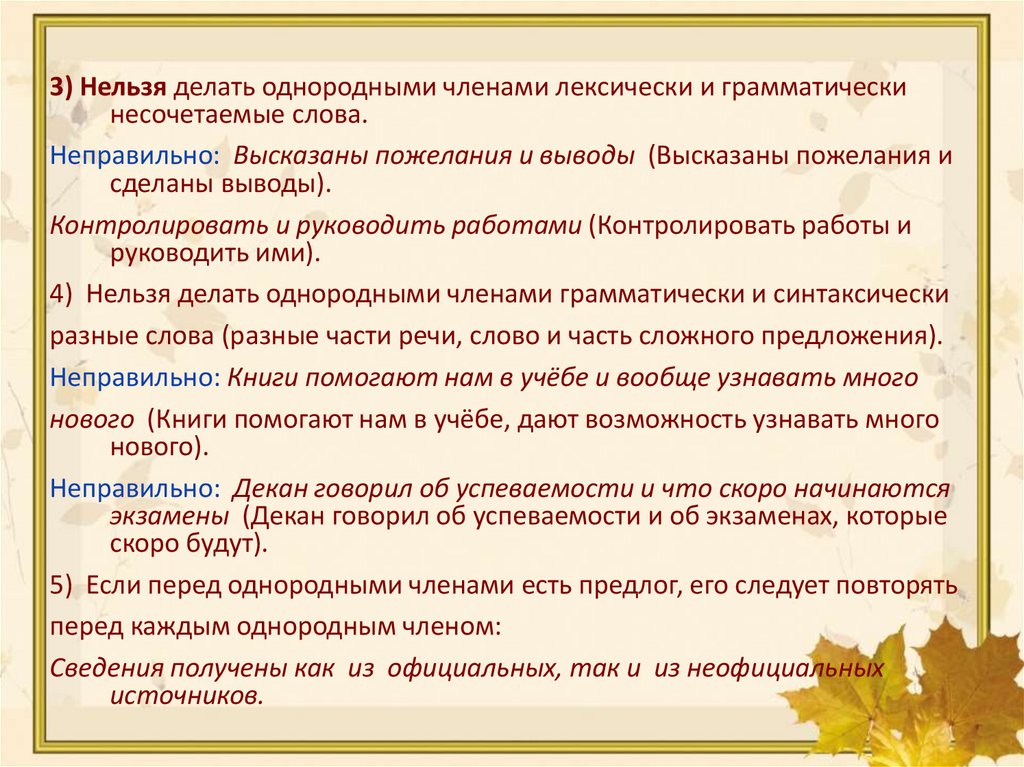 3) Нельзя делать однородными членами лексически и грамматическинесочетаемые слова.