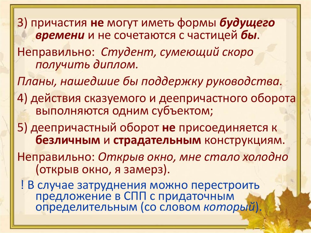 3) причастия не могут иметь формы будущеговремени и не сочетаются с частицей бы.