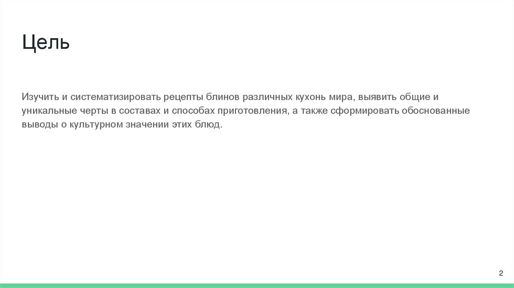 ЦельИзучить и систематизировать рецепты блинов различных кухонь мира, выявить общие и