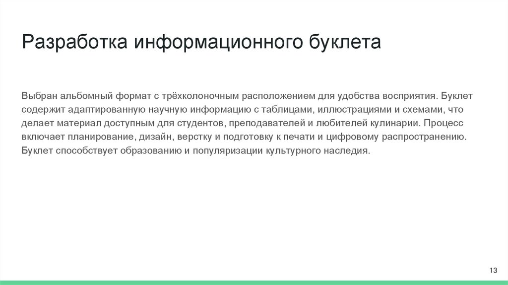Разработка информационного буклетаВыбран альбомный формат с трёхколоночным расположением для удобства восприятия. Буклет