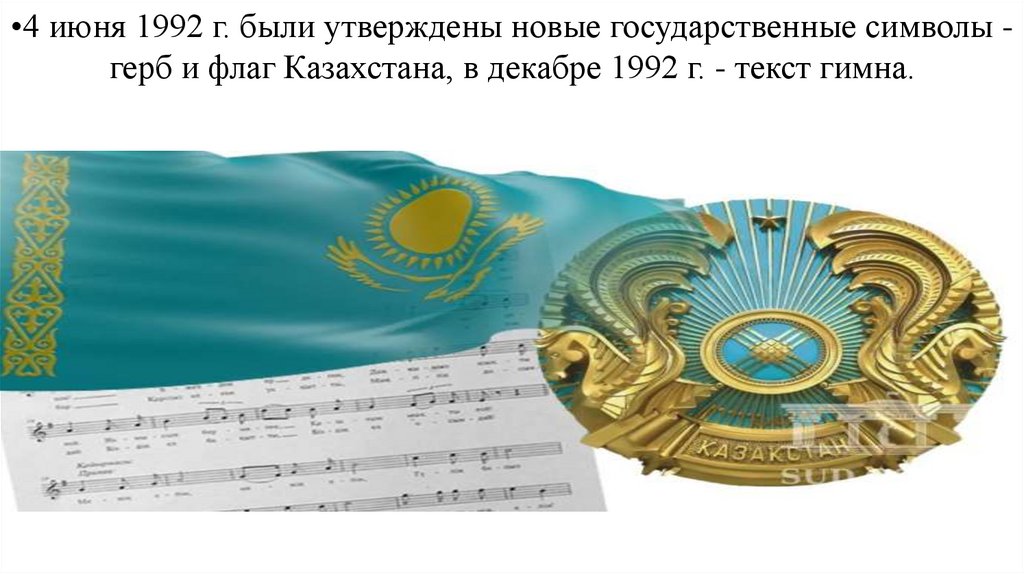 •4 июня 1992 г. были утверждены новые государственные символы герб и флаг Казахстана, в декабре 1992 г. - текст гимна.24. Создание основ конституционного строя общества. Утверждение символов РК.