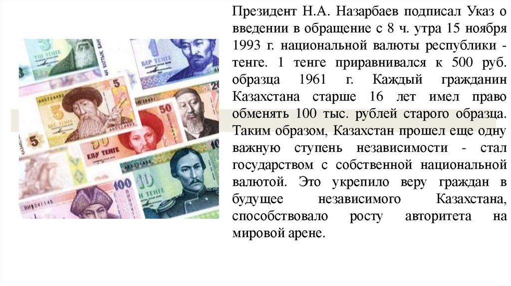 1993 г. национальной валюты республики тенге. 1 тенге приравнивался к 500 руб.