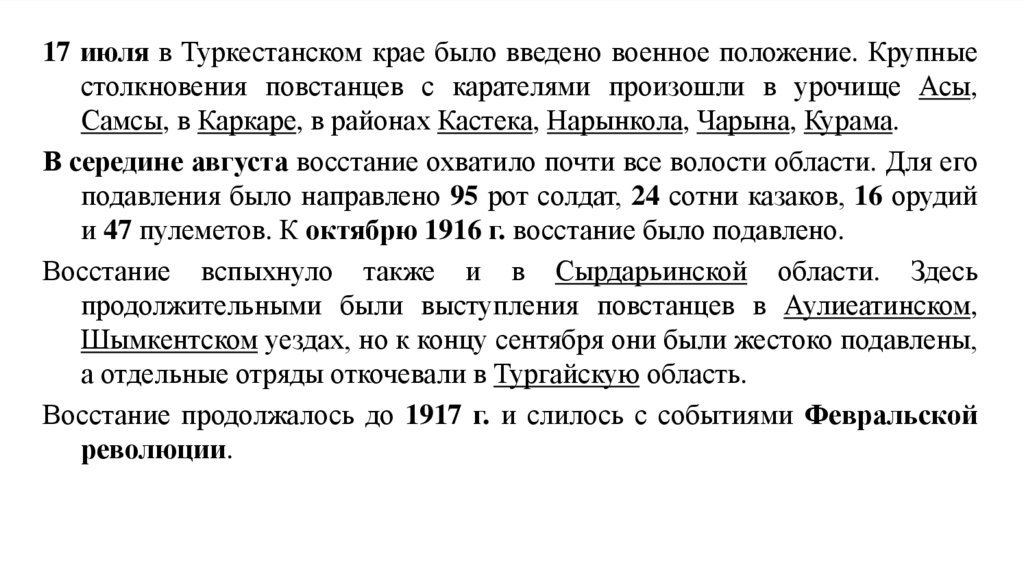 17 июля в Туркестанском крае было введено военное положение. Крупныестолкновения повстанцев с карателями произошли в урочище Асы,