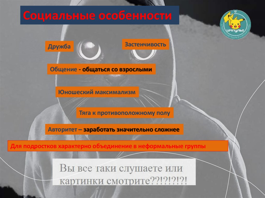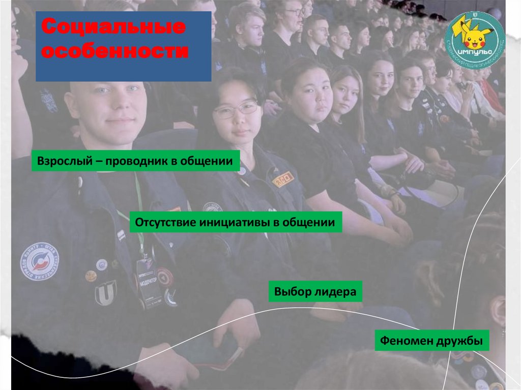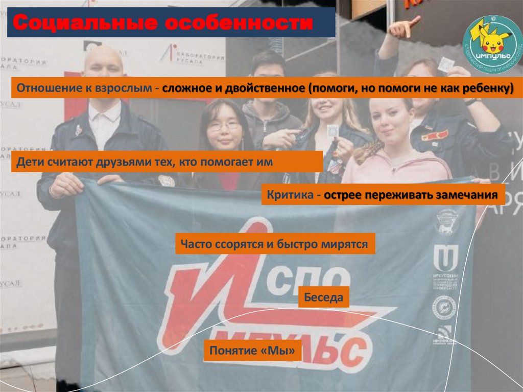 Социальные особенностиОтношение к взрослым - сложное и двойственное (помоги, но помоги не как ребенку)